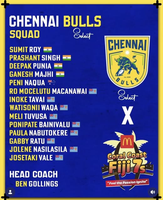 The Chennai Bulls made history as the first Indian team to compete in the McDonald’s Fiji Coral Coast 7s in January 2026, held at Lawaqa Park, Sigatoka. Coached by former Fiji 7s coach Ben Gollings, the squad featured4 Indian national players and local talent, aiming to gain experience and create history by winning a try on Fijian soil.